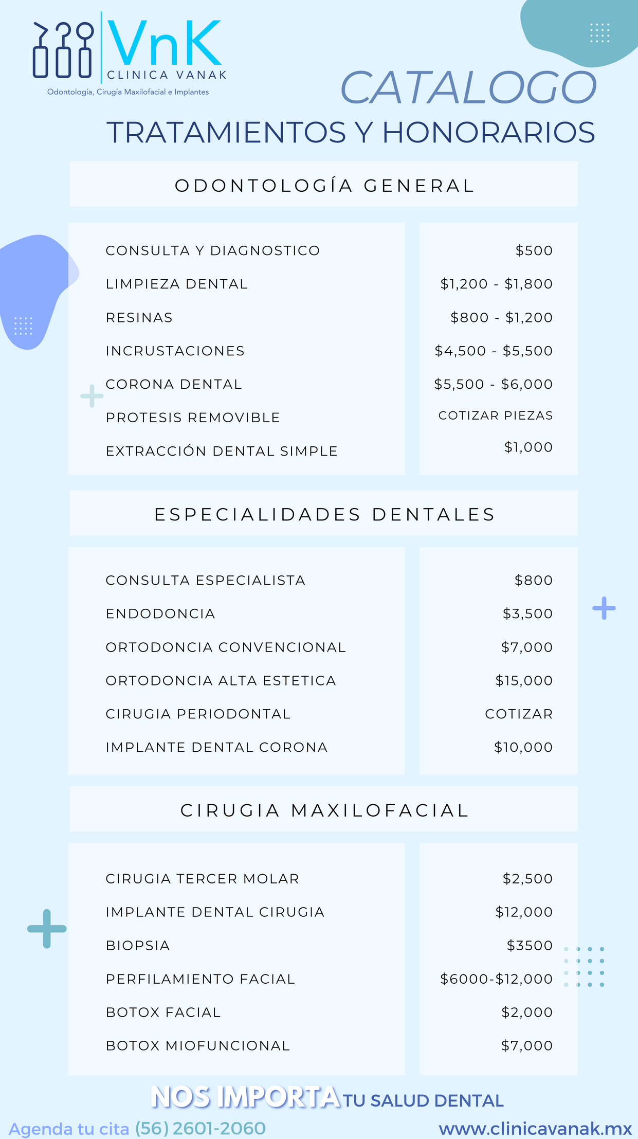 - La consulta por el odontólogo general tiene es de 500 pesos e incluye un diagnóstico integral, radiografías y recomendaciones para mejorar tu salud oral. La consulta por especialidad tiene un valor de 800 pesos.